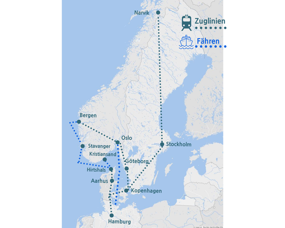 Norwegen ist per Zug und Fähre bequem erreichbar – hier sind die vier besten Routen auf einen Blick:
